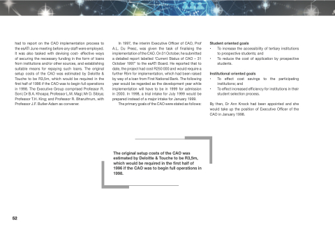 had to report on the CAO implementation process to the esATI June meeting before any staff were employed. It was also tasked with devising cost- effective ways of securing the necessary funding in the form of loans from institutions and/or other sources, and establishing suitable means for repaying such loans. The original setup costs of the CAO was estimated by Deloitte & Touche to be R3,5m, which would be required in the first half of 1996 if the CAO was to begin full operations in 1998. The Executive Group comprised Professor R. Soni; Dr B.A. Khoapa; Professor L.M. Magi; Mr D. Sibiya; Professor T.H. King; and Professor R. Bharuthrum, with Professor J.F. Butler-Adam as convener.
