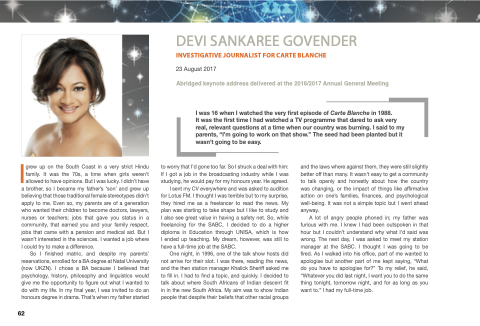 a brother, so I became my father’s ‘son’ and grew up believing that those traditional female stereotypes didn’t apply to me. Even so, my parents are of a generation who wanted their children to become doctors, lawyers, nurses or teachers; jobs that gave you status in a community, that earned you and your family respect, jobs that came with a pension and medical aid. But I wasn’t interested in the sciences. I wanted a job where I could try to make a difference.