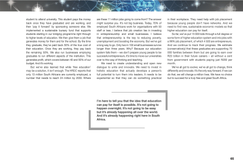 student to attend university. This student pays the money back once they have graduated and are working, and then ‘pay it forward’ by sponsoring someone else. We implemented a sustainable bursary fund that supports students starting in our bridging programme right through to higher levels of education. We then give them a job that generates money for them and for the school. By the time they graduate, they’ve paid back 50% of the true cost of their education. Once they are working, they pay back the remaining 50%. We also run businesses employing graduates to run different aspects of the institution. This generates profit, which covers between 40 and 50% of our budget. And it’s working.
