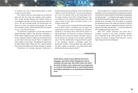 Here, he called for an “increase, across the board, in the standards of entry, process (what the students learn while at university) and output (whether the standards for graduating are high enough)” – a consistently high quality of education that stretches students academically. A theory he put into practise at the University of the Free State by increasing the admissions score to 38, refusing to kowtow to pressure from the powers that be, questioning whether he had “the interest of the black child at heart” – a move that raised the UFS undergraduate pass rate to 90%.