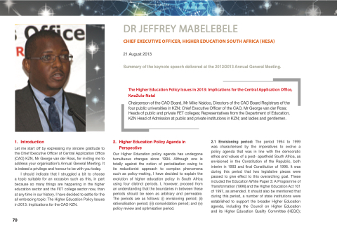 I should indicate that I struggled a bit to choose a topic suitable for an occasion such as this, in part because so many things are happening in the higher education sector and the FET college sector now, than at any time in our history. I have decided to settle for the all embracing topic: The Higher Education Policy Issues in 2013: Implications for the CAO KZN.