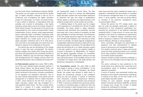 2.2 Rationalisation period: Soon came 1999 to 2004, one of the most ‘stressful higher education periods’ in South Africa’s history; the Asmal period. Firstly, one should indicate that some of the elements of the previous period continued to this period, including consolidation of the regulatory and legislative framework. One of the most seminal developments of the period was the development of a National Plan for Higher Education in 2001, which framed for the first time, the type of higher education system that was envisaged for a post-apartheid South Africa. The Plan, among others, called for a creation of a single, coordinated and responsive higher education system geared to meet