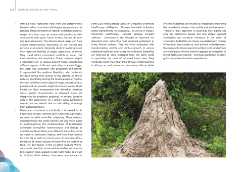 some Zulu Kings’s praises such as in Dingane’s: uVemvane lukaPhunga noMageba, uVemvan ‘olumabal ‘azibhadu, Ngibe ngiyaluthinta Iwahwaqabala... As well as in Shaka’s: UVemvane lukaPhunga, Lumabal’ azizinge sengath’ abekiwe... Uvemvane is also thought to represent the departed souls. Butterflies hold profound symbolism in many African cultures. They are often associated with transformation, rebirth, and spiritual growth. In various traditional belief systems across the continent, butterflies are believed to carry messages from the spirit world or symbolize the souls of departed loved ones. They symbolize much more than their physical metamorphosis in African art and culture. Across various African belief
