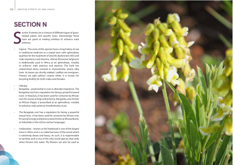 ection N streets are a mixture of different types of grass- related plants and specific trees. Interestingly these trees are good at making izimbiza to enhance male potency.
