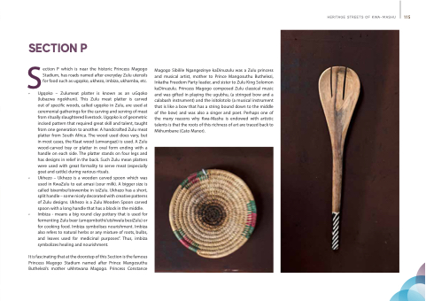 Section P which is near the historic Princess Magogo Stadium, has roads named after everyday Zulu utensils for food such as ugqoko, ukhezo, imbiza, ukhamba, etc.