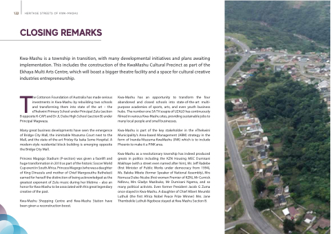 Kwa-Mashu is a township in transition, with many developmental initiatives and plans awaiting implementation. This includes the construction of the KwaMashu Cultural Precinct as part of the Ekhaya Multi Arts Centre, which will boast a bigger theatre facility and a space for cultural creative industries entrepreneurship.