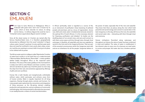 Since all the street names in C-Section are named after the famous KwaZulu-Natal rivers, it is therefore geographically demarcated as eMlanjeni from the word “umlambo”. In Nguni culture, water, “amanzi” is spiritual. It is also said that water spirit does not travel far (confined in rivers, pools, dams, lakes, ocean, etc.) and the one wanting to connect with it must go to its place to be clothed with its power.