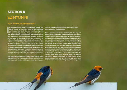 birds themselves) and proverbs, riddles and children’s games. Also considered is traditional bird lore (wisdom), examining the role played by various species as omens and portents, as indicators of bad luck, good luck, and evil, as forecasters of rain and storm, and as harbingers of the seasons. Here we see that the Bateleur Eagle (ingqungqulu) is linked to war, the Southern Ground Hornbill (insingizi) to thunder and heavy rain, the Red- chested Cuckoo (uphezukomkhono) to give signal for the start of the ploughing season, and the Jacobin Cuckoo (inkanku) to the start of summer. Some explanations are onomastic based, relating to the study of the history and origin of proper names.