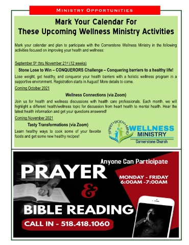 Mark your calendar and plan to participate with the Cornerstone Wellness Ministry in the following