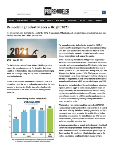 The National Association of Home Builders (NAHB) is proud to present this special supplement to Pro Remodeler that takes a broad look at the remodeling industry and examines the emerging trends and challenges facing this key sector of the residential construction industry.