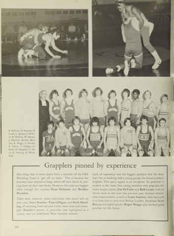 Lack of experience was the biggest problem that the team had. Yet, in working with a young group, the future is always brighter. This year’s squad is no exception. Its potential is evident in the many fine young wrestlers who populate the lower weight classes.Jim DeYulio and Bob Lyons, both of whom were on the team the previous year, showed tremen dous improvement, as well as Louis Santaro, who had a pin in a close loss to arch-rival Bishop Ludden. Freshman Scott Barcza and eighth-grader Roger Briggs also showed great promise for the future.
