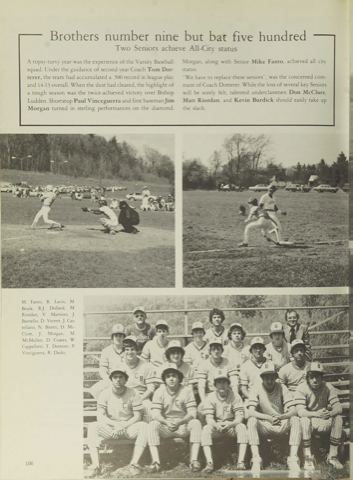 A topsy-turvy year was the experience of the Varsity Baseball squad. Under the guidance of second year Coach Tom Dot- terer, the team had accumulated a .500 record in league play and 14-13 overall. When the dust had cleared, the highlight of a tough season was the twice-achieved victory over Bishop Ludden. Shortstop Paul Vinceguerra and first basemanjim Morgan turned in sterling performances on the diamond.