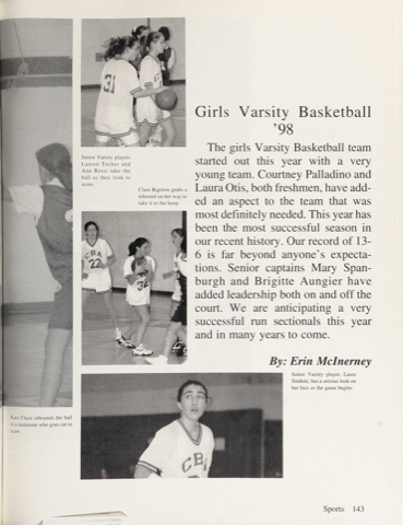 The girls Varsity Basketball team started out this year with a very young team. Courtney Palladino and Laura Otis, both freshmen, have add ed an aspect to the team that was most definitely needed. This year has been the most successful season in our recent history. Our record of 13- 6 is far beyond anyone’s expecta tions. Senior captains Mary Span- burgh and Brigitte Aungier have added leadership both on and off the court. W e are anticipating a very successful run sectionals this year and in many years to come.