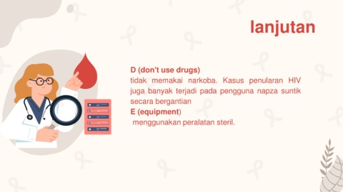 lanjutan D (don't use drugs) tidak memakai narkoba. Kasus penularan HIV juga banyak terjadi pada pengguna napza suntik secara bergantian E (equipment) menggunakan peralatan steril.