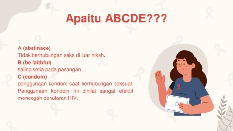 Apaitu ABCDE??? A (abstinace) Tidak berhubungan seks di luar nikah. B (be faithful) saling setia pada pasangan C (condom) penggunaan kondom saat berhubungan seksual. Penggunaan kondom ini dinilai sangat efektif mencegah penularan HIV.