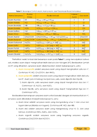 Tabel 1. Beberapa Contoh Asam, Nama Asam, dan Persamaan Reaksi Ionisasinya