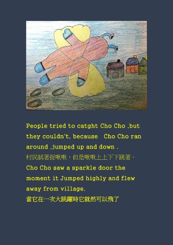 People tried to catght Cho Cho ,but they couldn't, because Cho Cho ran around ,jumped up and down . 村民試著捉啾啾,但是啾啾上上下下跳著。 Cho Cho saw a sparkle door the moment it Jumped highly and flew away from village. 當它在一次大跳躍時它就然可以飛了