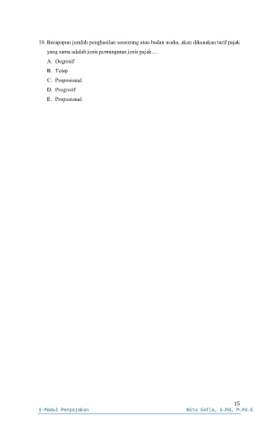 10. Berapapun jumlah penghasilan seseorang atau badan usaha, akan dikenakan tarif pajak yang sama adalah jenis pemungutan jenis pajak… A. Degresif B. Tetap C. Proposional D. Progresif E. Proposional 15 E-Modul Perpajakan Nita Sofia, S.Pd, M.Pd.E