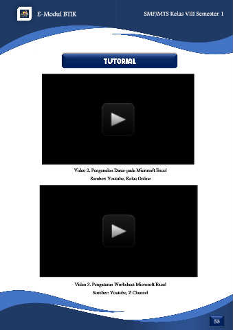 E-Modul BTIK SMP/MTS Kelas VIII Semester 1 E-Modul BTIK Video 2. Pengenalan Dasar pada Microsoft Excel Sumber: Youtube, Kelas Online Video 3. Pengaturan Worksheet Microsoft Excel Sumber: Youtube, Z Channel 53