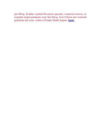 pie filling. Scatter roasted Brussels sprouts, creamed onions, or roasted sweet potatoes over the filling. And if there are mashed potatoes left over, make a Potato Mash topper (here).