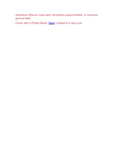 Substitute leftover roast beef, shredded cooked brisket, or browned ground beef. Cover with a Potato Mash (here) instead of a top crust.