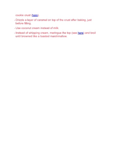 cookie crust (here). Drizzle a layer of caramel on top of the crust after baking, just before filling. Use coconut cream instead of milk. Instead of whipping cream, meringue the top (see here) and broil until browned like a toasted marshmallow.