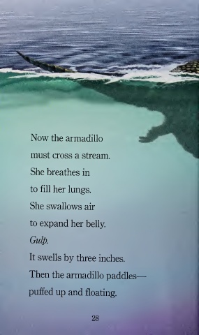 Now the armadillo must cross a stream. She breathes in to fill her lungs. She swallows air to expand her belly. Gulp. It swells by three inches. Then the armadillo paddles puffed up and floating.