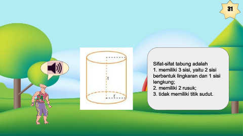 31 Sifat-sifat tabung adalah 1. memiliki 3 sisi, yaitu 2 sisi berbentuk lingkaran dan 1 sisi lengkung; 2. memiliki 2 rusuk; 3. tidak memiliki titik sudut.