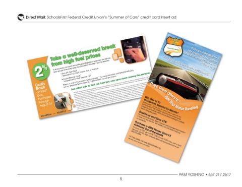 Direct Mail: SchoolsFirst Federal Credit Union’s “Summer of Cars” credit card insert ad PAM YOSHINO • 657.217.2617 5