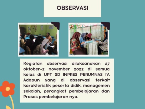 OBSERVASI Kegiatan observasi dilaksanakan 27 oktober-2 november 2022 di semua kelas di UPT SD INPRES PERUMNAS IV. Adapun yang di observasi terkait karakteristik peserta didik, managemen sekolah, perangkat pembelajaran dan Proses pembelajaran nya.