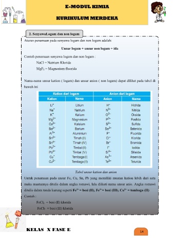 Nama-nama unsur kation ( logam) dan unsur anion ( non logam) dapat dilihat pada tabel di