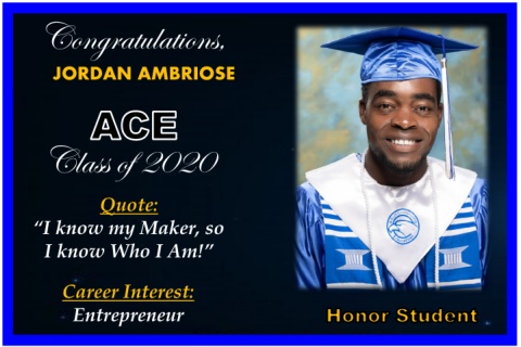 Congratulations, JORDAN AMBRIOSE Class of 2020 Quote: “I know my Maker, so I know Who I Am!” Career Interest: Entrepreneur
