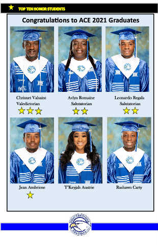 T O P T E N H O N O R S T U D E N T S TOP TEN HONOR STUDENTS Congratulations to ACE 2021 Graduates Chrisnet Valsaint Avlyn Romaine Leonardo Regala Valedictorian Salutatorian Salutatorian Jean Ambriose T’Keyjah Austrie Rashawn Carty 8