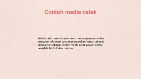 Contoh media cetak Media cetak sendiri merupakan media penyampai dan penyalur informasi yang menggunakan kertas sebagai medianya, sebagai contoh media cetak adalah koran, majalah, tabloit, dan bulletin.