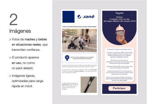 2 Imágenes > Fotos de madres y bebés en situaciones reales, que transmitan confianza. > El producto aparece en uso, no como un pack aislado. > Imágenes ligeras, optimizadas para carga rápida en móvil.