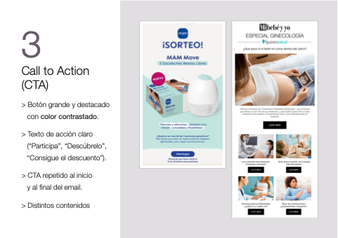 3 Call to Action (CTA) > Botón grande y destacado con color contrastado. > Texto de acción claro (“Participa”, “Descúbrelo”, “Consigue el descuento”). > CTA repetido al inicio y al final del email. > Distintos contenidos