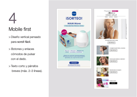 4 Mobile first > Diseño vertical pensado para scroll fácil. > Botones y enlaces cómodos de pulsar con el dedo. > Texto corto y párrafos breves (máx. 2–3 líneas).
