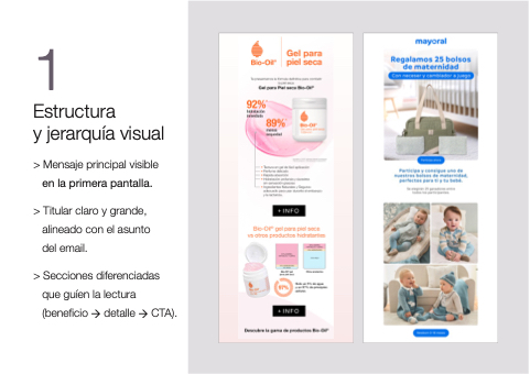 1 Estructura y jerarquía visual > Mensaje principal visible en la primera pantalla. > Titular claro y grande, alineado con el asunto del email. > Secciones diferenciadas que guíen la lectura (beneficio → detalle → CTA).