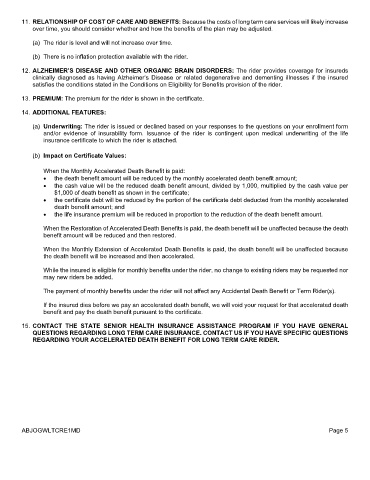 REGARDING YOUR ACCELERATED DEATH BENEFIT FOR LONG TERM CARE RIDER.
