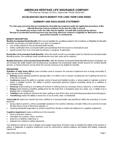 ACCELERATED DEATH BENEFIT FOR LONG TERM CARE RIDER