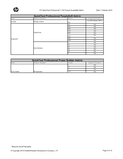 HP QuickTest Professional 11.00 Product Availability Matrix Date: 1 October 2010