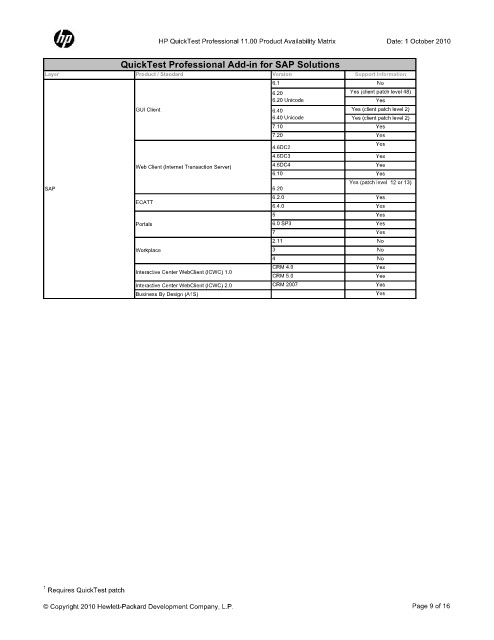 HP QuickTest Professional 11.00 Product Availability Matrix Date: 1 October 2010