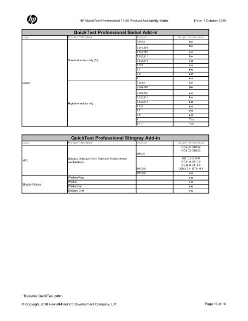 HP QuickTest Professional 11.00 Product Availability Matrix Date: 1 October 2010