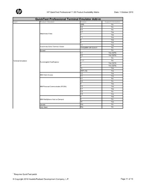 HP QuickTest Professional 11.00 Product Availability Matrix Date: 1 October 2010