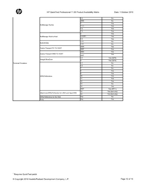 HP QuickTest Professional 11.00 Product Availability Matrix Date: 1 October 2010