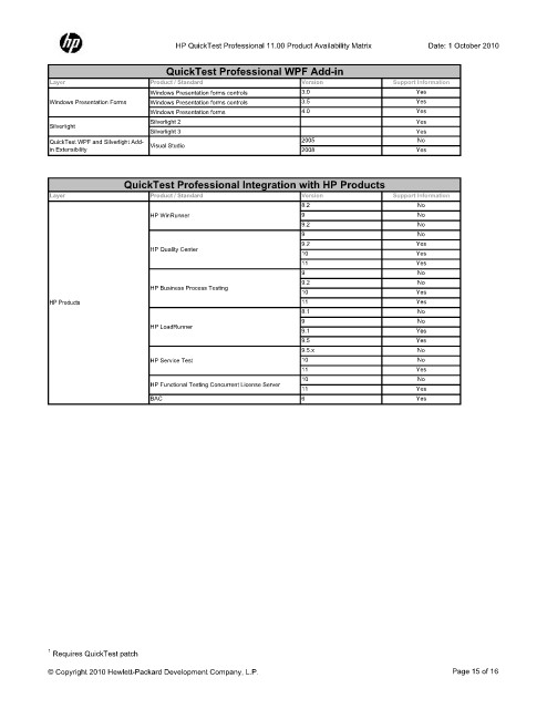 HP QuickTest Professional 11.00 Product Availability Matrix Date: 1 October 2010