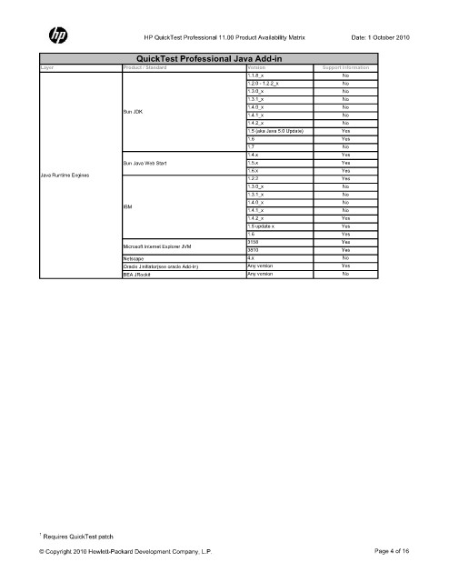 HP QuickTest Professional 11.00 Product Availability Matrix Date: 1 October 2010