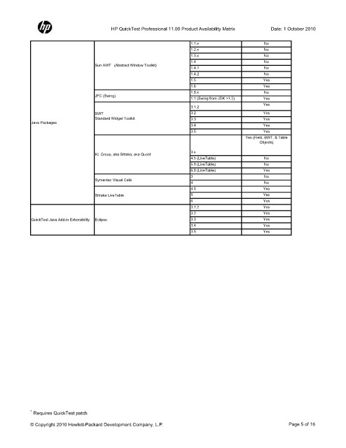 HP QuickTest Professional 11.00 Product Availability Matrix Date: 1 October 2010