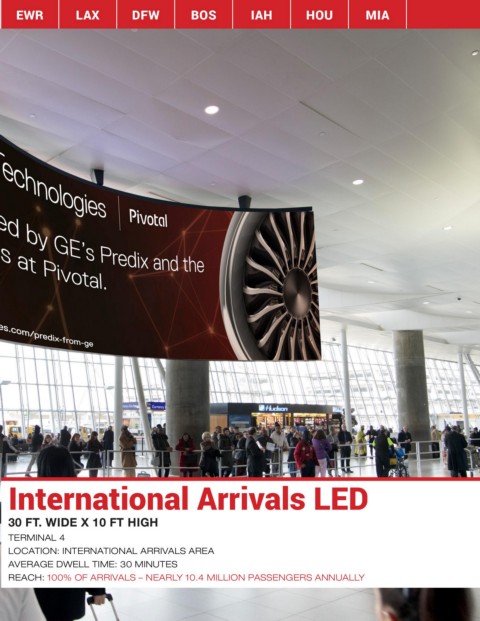 LGA EWR LAX DFW BOS IAH HOU MIA International Arrivals LED 30 FT. WIDE X 10 FT HIGH TERMINAL 4 LOCATION: INTERNATIONAL ARRIVALS AREA AVERAGE DWELL TIME: 30 MINUTES REACH: 100% OF ARRIVALS – NEARLY 10.4 MILLION PASSENGERS ANNUALLY