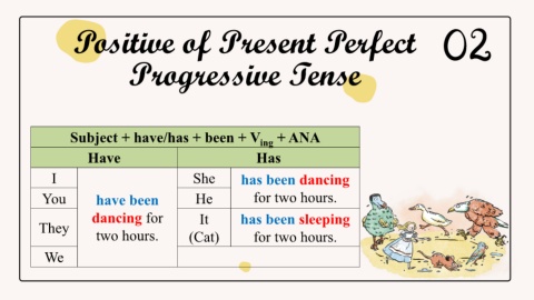 Positive of Present Perfect 02 Progressive Tense Subject + have/has + been + V + ANA ing Have Has I She has been dancing You have been He for two hours. dancing for It has been sleeping They two hours. (Cat) for two hours. We
